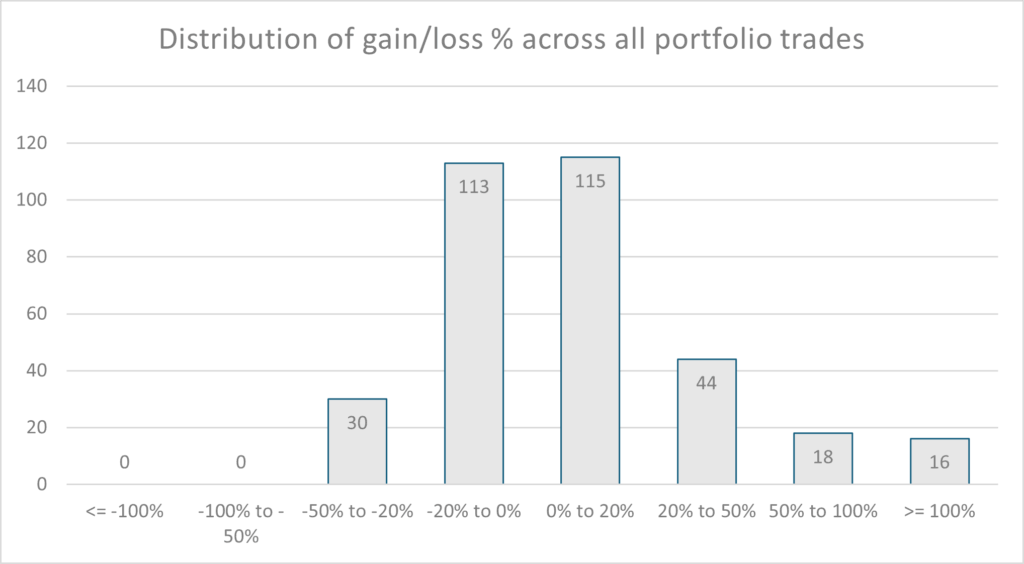 As can be seen from the “Distribution of Gain/Loss %” chart, the system’s bias is to keep winning positions and trim losing positions early thereby limiting loss per position. The system has shown success in picking numerous “multibaggers” that drive portfolio growth and allow the system to compound gains.